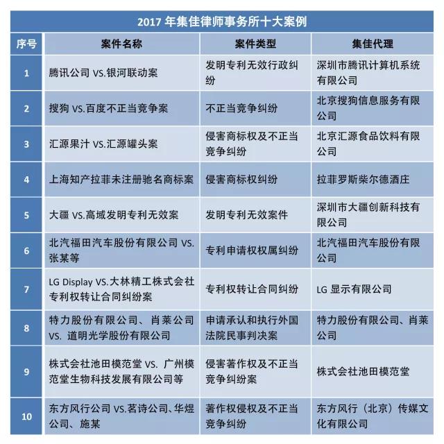 集佳律師事務(wù)所十大知識(shí)產(chǎn)權(quán)典型案例已經(jīng)連續(xù)評(píng)選了四年,案例評(píng)選委員會(huì)本著客觀、中立的原則,經(jīng)過初選、復(fù)選以及評(píng)議,參考最高人民法院及全國各地法院評(píng)選的十大知識(shí)產(chǎn)權(quán)案件,最終從2017年度集佳代理的三百多件訴訟案件中篩選出了十件典型案件,該十件案件涉及專利侵權(quán)與無效、商標(biāo)侵權(quán)、商標(biāo)授權(quán)確權(quán)、互聯(lián)網(wǎng)不正當(dāng)競(jìng)爭(zhēng)、著作權(quán)及涉外判決的執(zhí)行等領(lǐng)域,具有較強(qiáng)的法律適用的典型意義和較大的社會(huì)影響,充分地體現(xiàn)了國內(nèi)司法保護(hù)的良好局面,也展現(xiàn)出了訴訟代理團(tuán)隊(duì)的專業(yè)水準(zhǔn),同時(shí)也為與之類似的案件提供了可資借鑒的先例范本。以下為2017年度集佳律師事務(wù)所十大案件名錄:
