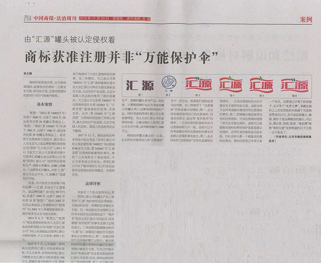 集佳文章《由“匯源”罐頭被認(rèn)定侵權(quán)看商標(biāo)獲準(zhǔn)注冊(cè)并非“萬能保護(hù)傘”》在《中國(guó)商報(bào)》發(fā)表
