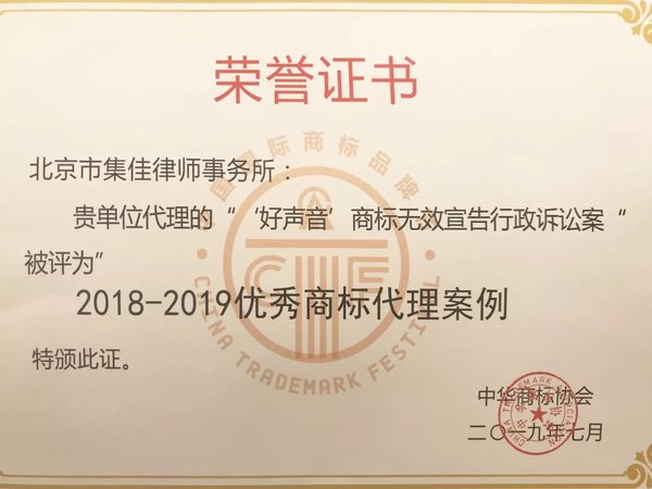 7月6日,第十一屆中國(guó)國(guó)際商標(biāo)品牌節(jié)在銀川正式拉開(kāi)帷幕,各項(xiàng)活動(dòng)如火如荼地進(jìn)行著。在商標(biāo)典型案例評(píng)析論壇上,集佳再獲嘉獎(jiǎng),由集佳代理的“好聲音”商標(biāo)無(wú)效宣告行政案被評(píng)為“2018-2019優(yōu)秀商標(biāo)代理案例”。