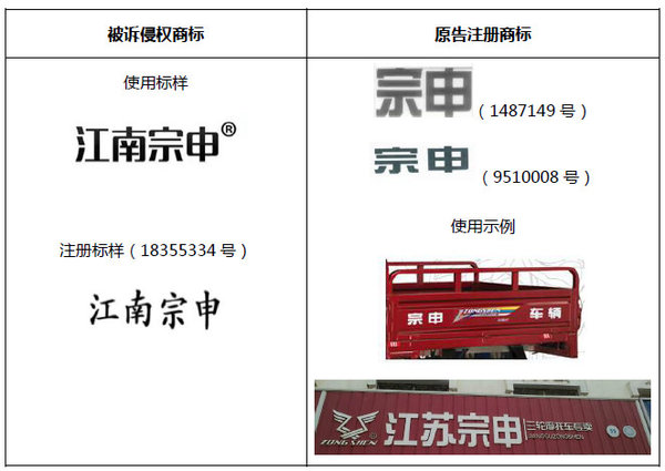 ”商標,指定使用商品為12類“小汽車;汽車;電動自行車;電動三輪車;助力車”等,于2016年12月28日注冊公告。李某授權(quán)另一自然人申某某使用該商標,申某某轉(zhuǎn)授權(quán)被告方生產(chǎn)、銷售“江南宗申”電動三輪車。涉案侵權(quán)商標與宗申商標對比如下: