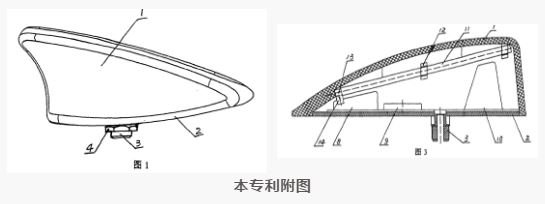 該專利的權(quán)利要求1內(nèi)容為“一種鯊魚鰭式天線,其特征在于具有天線外殼,天線外殼內(nèi)側(cè)上部設(shè)置有無線電接收天線,無線電接收天線一端設(shè)有天線信號(hào)輸出端,天線信號(hào)輸出端通過天線連接元件與天線放大器信號(hào)輸入端相連接,或直接與同軸電纜匹配相連,天線外殼底部裝有安裝底板;所述無線電接收天線通過注塑嵌裝或固定卡裝在天線外殼內(nèi)側(cè)上部;在天線外殼內(nèi)側(cè)上部設(shè)置有無線電接收天線,所述無線電接收天線采用螺旋狀彈簧天線、或金屬天線,增加了天線接收無線電信號(hào)的有效長(zhǎng)度,實(shí)現(xiàn)360度全向性信號(hào)接收;所述無線電接收天線為AM/FM共用天線?!?/p>