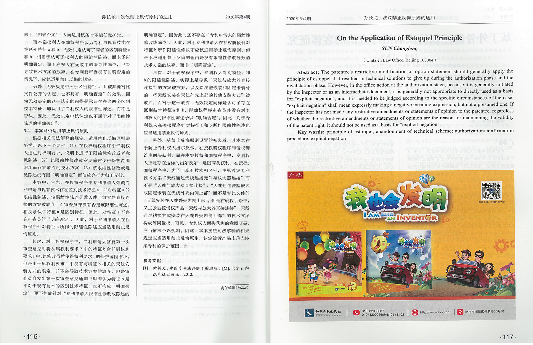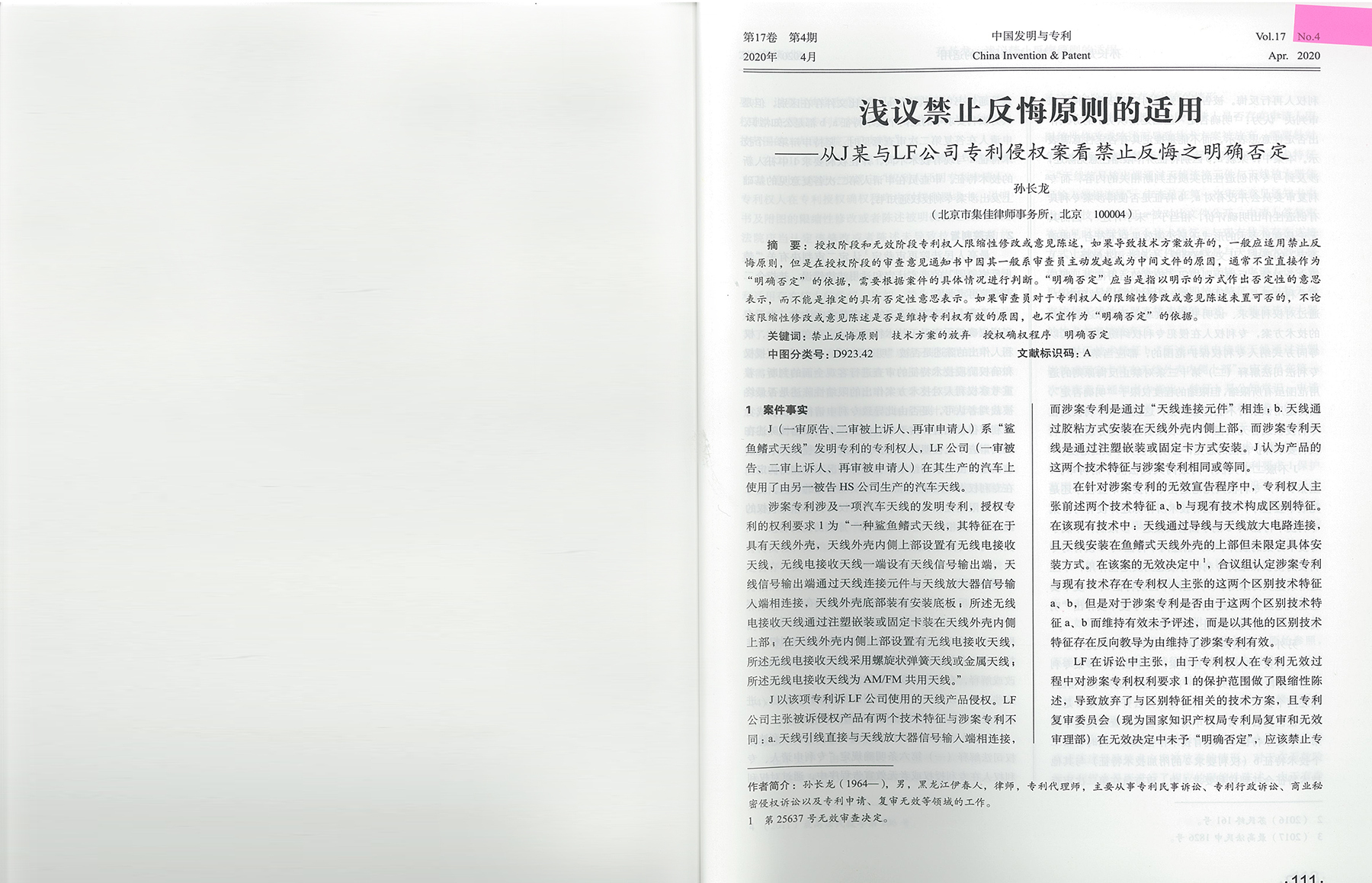 集佳文章《淺議禁止反悔原則的適用——從J某與LF公司專利侵權(quán)案看禁止反悔之明確否定》在《中國發(fā)明與專利》發(fā)表