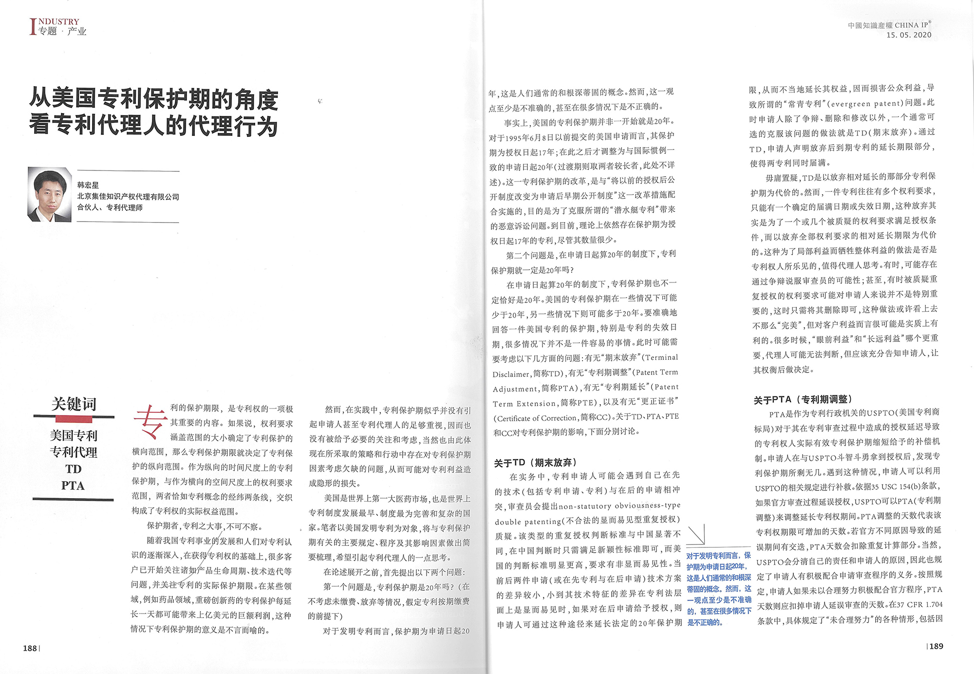 集佳文章《從美國專利保護(hù)期的角度看專利代理人的代理行為》在《中國知識產(chǎn)權(quán)》發(fā)表