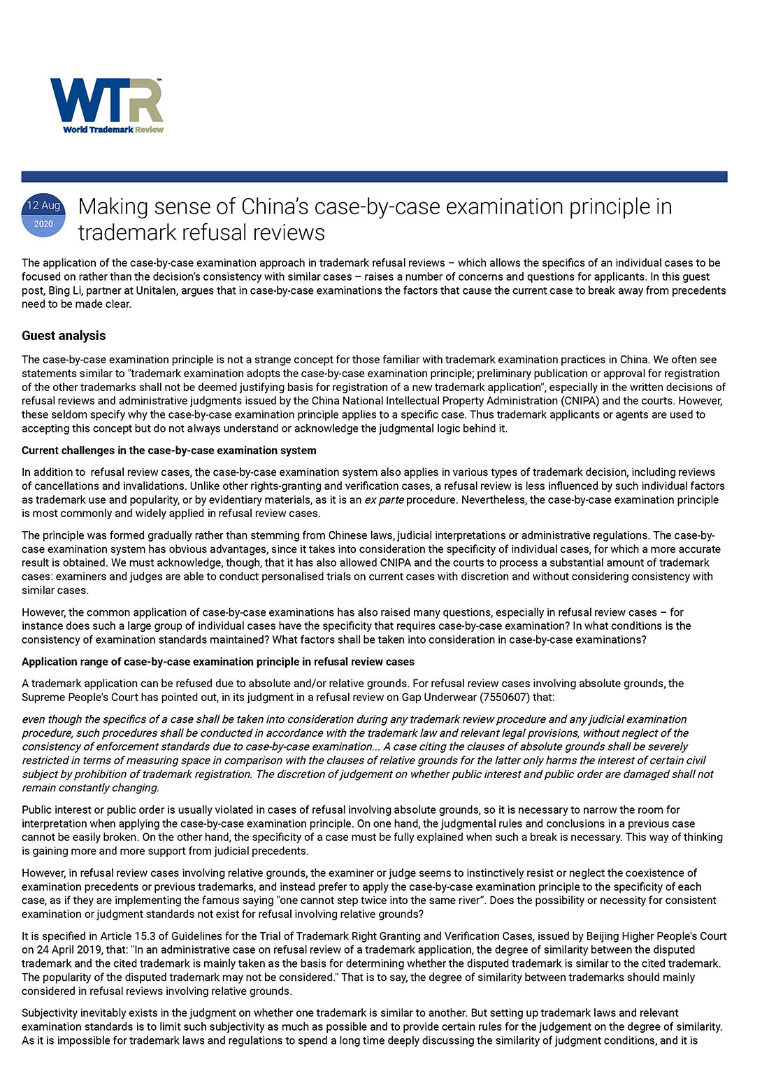 集佳文章《Making sense of China’s case-by-case examination principle in trademark refusal reviews》在《WTR》發(fā)表