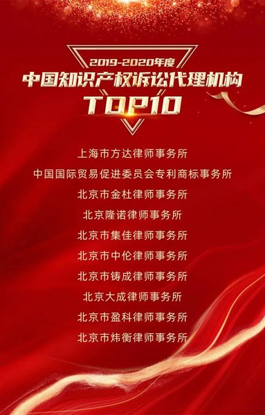 2020年12月2日,知識產(chǎn)權(quán)領(lǐng)域權(quán)威媒體知產(chǎn)力與知產(chǎn)寶重磅推出“2019-2020年度中國知識產(chǎn)權(quán)訴訟代理機構(gòu)TOP 10”排行榜,北京市集佳律師事務(wù)所憑借其優(yōu)質(zhì)的服務(wù)、卓越的業(yè)務(wù)能力和處理疑難案件的突出能力,榮登TOP10榜單!