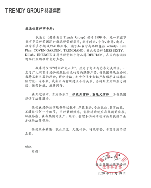 近日,集佳收到來自赫基集團(tuán)的表揚(yáng)信,信中,客戶對集佳張亞洲律師、董逸文律師的辛勤付出表示感謝,為他們細(xì)致高效的專業(yè)服務(wù)、敬業(yè)正直的工作態(tài)度點(diǎn)贊!