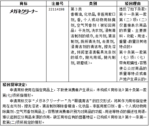 該件商標(biāo)由日文片假名組成,如果僅從外觀考量,不會產(chǎn)生導(dǎo)致消費者誤認(rèn)或者缺乏顯著性的可能,但審查員在裁定中明確指明了該單詞的含義,并判定“缺乏商標(biāo)應(yīng)有的顯著特征”。