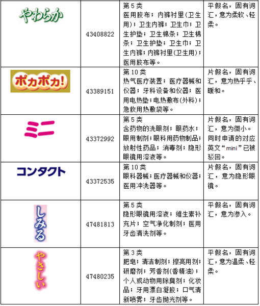 以上商標(biāo)均為日文假名商標(biāo),目前都通過初審獲得注冊。從商標(biāo)的外觀來看,對于未學(xué)習(xí)過日語的一般消費者來說,無法理解其含義,消費者對該類商標(biāo)最多停留在外文商標(biāo)這一認(rèn)識程度,對外觀的記憶很難達(dá)到深刻或準(zhǔn)確的程度。但對于有一定程度的日語學(xué)習(xí)者來說,上述單詞都屬于日語中十分簡易且常見常用的單詞,根據(jù)上表中對各個商標(biāo)含義的介紹,可以判斷出,對于熟悉日語的相關(guān)消費者,上述商標(biāo)在其對應(yīng)的指定商品上使用,恐難以起到區(qū)分商品來源的作用。