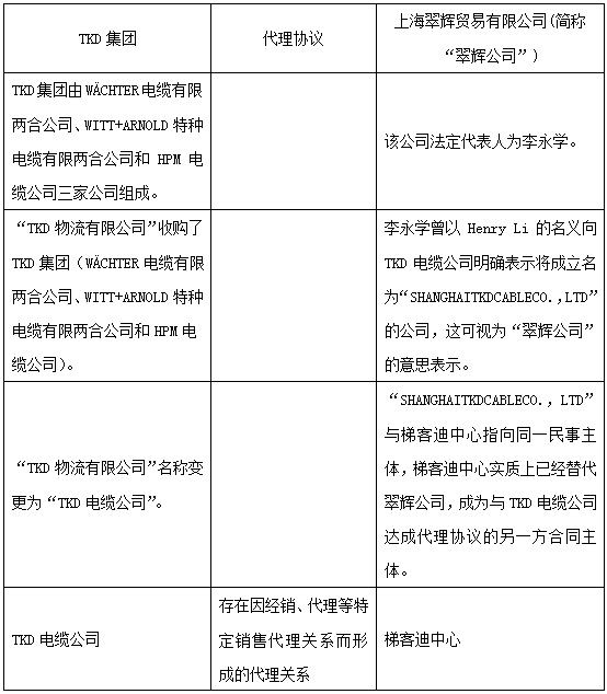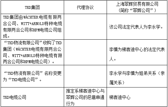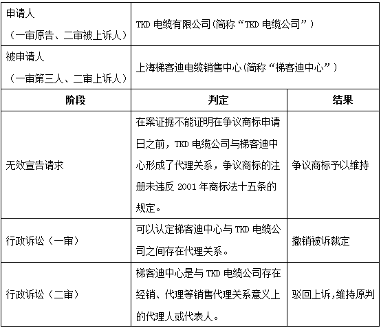 可知,該案雙方雖然不屬于直接的代理關(guān)系(即無法簡(jiǎn)單通過代理、經(jīng)銷合同以及交易憑證、采購(gòu)資料等就直接體現(xiàn)雙方的代理或經(jīng)銷關(guān)系),但通過關(guān)系的梳理及以多份證據(jù)共同形成證據(jù)鏈,一方面可證明梯客迪中心實(shí)質(zhì)上已經(jīng)替代翠輝公司,成為與TKD電纜公司達(dá)成代理協(xié)議的另一方合同主體,從而可以認(rèn)定雙方存在代理關(guān)系;另一方面,也可證明梯客迪中心和翠輝公司的法定代表人為親屬關(guān)系,從而推定其之間具有串通合謀行為。由此,法院認(rèn)定該案雙方之間存在代理關(guān)系,并適用《商標(biāo)法》第十五條第一款對(duì)其予以規(guī)制。