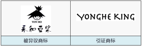 2019年,國內(nèi)某企業(yè)的“永和豆?jié){YON HO及圖”第29;30;43;32類歐盟商標(biāo)申請收到被異議通知。異議人的主要異議理由為申請商標(biāo)與其在先的第29;30;43類“YONGHE KING”商標(biāo)構(gòu)成混淆誤認(rèn)。雙方商標(biāo)指定商品均主要為食品、飲食服務(wù)相關(guān),因此,本案爭議焦點(diǎn)也為雙方商標(biāo)在標(biāo)識上是否近似以及雙方共存是否可能導(dǎo)致混淆。