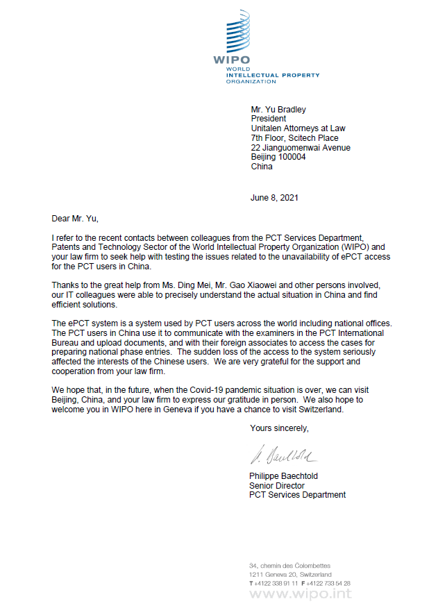 近日,世界知識產(chǎn)權(quán)組織(WIPO)國際局PCT服務(wù)部高級司長Philippe Baechtold向集佳合伙人會議主席于澤輝所長發(fā)來感謝信,對協(xié)助PCT服務(wù)部完美解決了WIPO ePCT系統(tǒng)在中國使用問題的集佳工作人員表示衷心感謝!