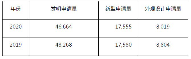 根據(jù)公布情況來(lái)看,中國(guó)臺(tái)灣智慧財(cái)產(chǎn)局2020年共受理72,238件發(fā)明專利申請(qǐng),比2019年減少3.2%;其中受理發(fā)明專利申請(qǐng)46,664件,比2019年減少3.3%;受理新型專利申請(qǐng)17,555件,與2019年持平;受理外觀設(shè)計(jì)專利申請(qǐng)8,019件,比2019年減少8.9%。具體見(jiàn)下表: