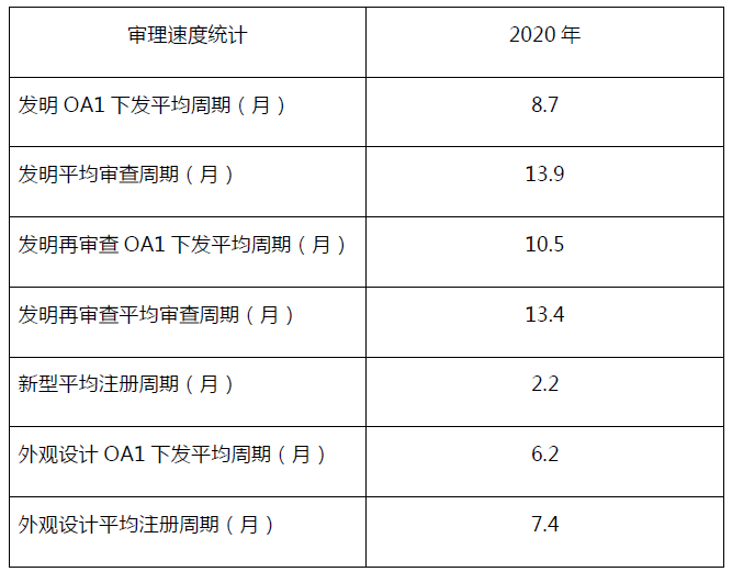 2020年中國(guó)臺(tái)灣智慧財(cái)產(chǎn)局審理速度統(tǒng)計(jì),見(jiàn)下表: