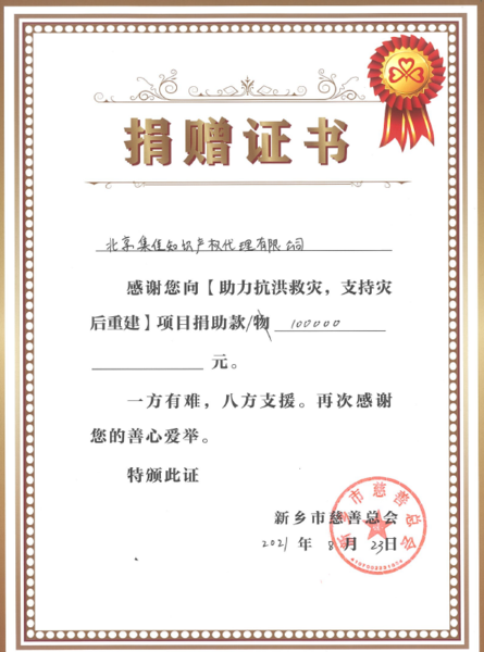 風(fēng)雨無情人有情,一方有難,八方支援。災(zāi)情發(fā)生后,集佳迅速響應(yīng)號召,通過中共首都知識產(chǎn)權(quán)服務(wù)業(yè)協(xié)會委員會向河南受災(zāi)地區(qū)捐贈10萬元,用于支援抗汛和災(zāi)后重建工作。許多集佳員工也在第一時間獻出愛心,自發(fā)向災(zāi)區(qū)捐款捐物,幫助受災(zāi)群眾渡過難關(guān),重建家園。