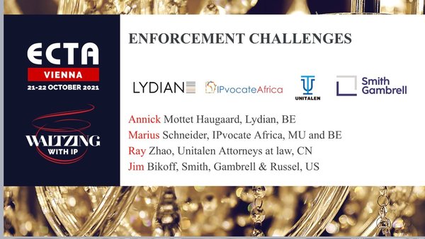 歐洲商標(biāo)協(xié)會(huì)(ECTA)第39屆年會(huì)“與IP共舞”將于2021年10月21-22日在維也納舉行。為了重現(xiàn)ECTA年會(huì)的啟動(dòng)慣例,10月13日,ECTA在線舉行了年會(huì)例行的“周三研討會(huì)”——“商標(biāo)保護(hù)挑戰(zhàn)研討會(huì)”與“WIPO-EUIPO研討會(huì)”,這也是年會(huì)“重要會(huì)議包”內(nèi)容之一。集佳合伙人趙雷律師應(yīng)邀參加商標(biāo)權(quán)保護(hù)挑戰(zhàn)的主題討論,與來(lái)自比利時(shí)的前ECTA主席、Lydian事務(wù)所的高級(jí)合伙人Annick,美國(guó)Smith, Gambrell & Russel事務(wù)所的高級(jí)合伙人Jim,以及毛里求斯IPvocate事務(wù)所的Marius等行業(yè)專(zhuān)家共同探討商標(biāo)權(quán)人在全球各地商標(biāo)權(quán)保護(hù)的挑戰(zhàn)與對(duì)策。