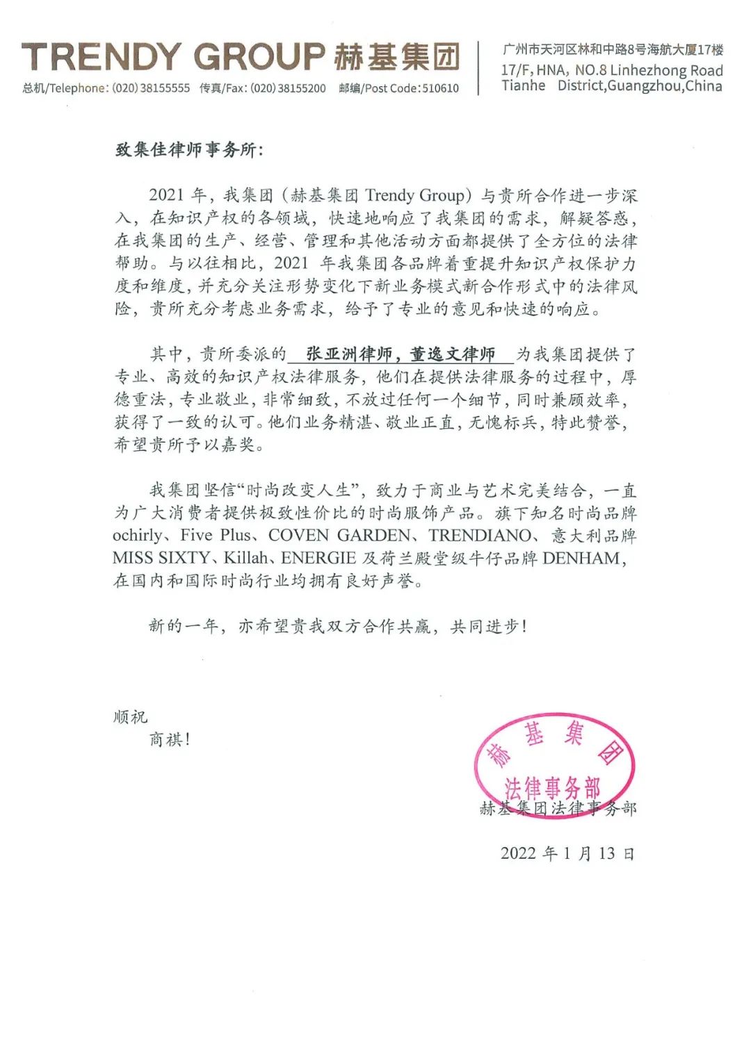 新春佳節(jié)將至,集佳收到赫基集團(tuán)發(fā)來的表揚(yáng)信,贊譽(yù)集佳律師事務(wù)所張亞洲律師和董逸文律師專業(yè)、高效的知識(shí)產(chǎn)權(quán)法律服務(wù)。