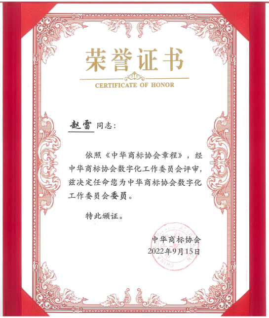 在本次論壇上,中華商標(biāo)協(xié)會(huì)數(shù)字化工作委員會(huì)正式成立,并舉行揭牌儀式?!吨R(shí)產(chǎn)權(quán)強(qiáng)國(guó)建設(shè)綱要(2021-2035年)》、《“十四五”國(guó)家知識(shí)產(chǎn)權(quán)保護(hù)和運(yùn)用規(guī)劃》及《知識(shí)產(chǎn)權(quán)公共服務(wù)“十四五”規(guī)劃》等文件強(qiáng)調(diào)指出,要建立市場(chǎng)化、社會(huì)化的信息加工和服務(wù)機(jī)制,推動(dòng)知識(shí)產(chǎn)權(quán)信息公共服務(wù)和市場(chǎng)化服務(wù)協(xié)調(diào)發(fā)展;要加強(qiáng)知識(shí)產(chǎn)權(quán)信息化、智能化基礎(chǔ)設(shè)施建設(shè),推動(dòng)知識(shí)產(chǎn)權(quán)數(shù)字化服務(wù)普惠應(yīng)用。同時(shí),對(duì)于企業(yè)和商標(biāo)代理機(jī)構(gòu)而言,如何在數(shù)字化時(shí)代進(jìn)行高效的管理和溝通,做好品牌管理、預(yù)警和保護(hù)工作,一直都是市場(chǎng)主體的核心訴求?;谏鲜鲂畔⒒蛿?shù)字化的政策背景以及市場(chǎng)主體對(duì)數(shù)字化轉(zhuǎn)型的需求,中華商標(biāo)協(xié)會(huì)成立“數(shù)字化工作委員會(huì)”,旨在促進(jìn)行業(yè)數(shù)字化轉(zhuǎn)型升級(jí),為貫徹上述《綱要》和《規(guī)劃》做出應(yīng)有貢獻(xiàn)。會(huì)上,中華商標(biāo)協(xié)會(huì)馬夫會(huì)長(zhǎng)為首批數(shù)字化工作委員會(huì)的委員單位和委員頒發(fā)證書。集佳知識(shí)產(chǎn)權(quán)入選了首批數(shù)字化工作委員會(huì)委員單位,趙雷律師被任命為數(shù)字化工作委員會(huì)委員。