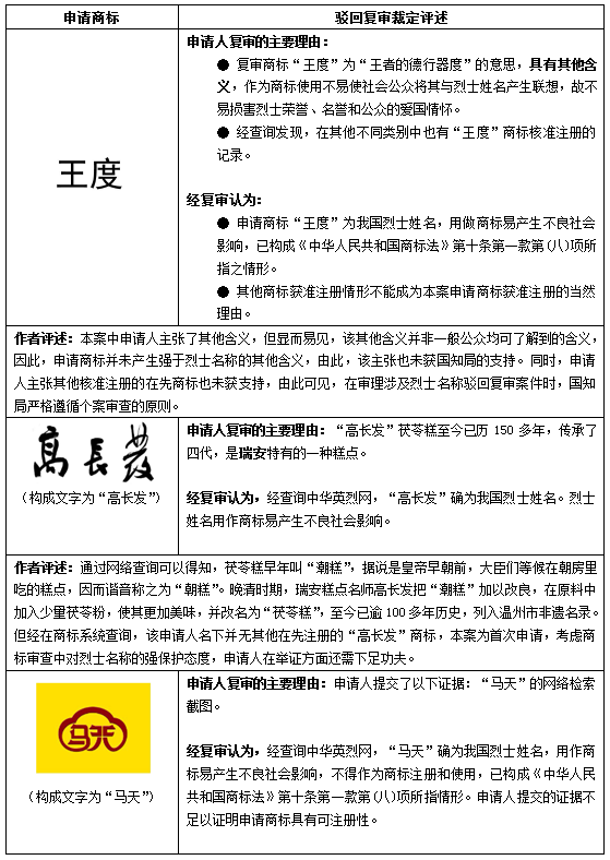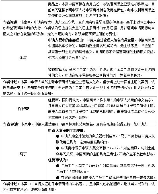 綜上分析,縱然從商標申請人的角度出發(fā),其申請商標具有一定的合理來源,其商標使用難以使消費者聯(lián)想到烈士名稱,但從以上案例可以看出,在商標申請的審查階段,國知局對烈士名稱采取強保護的態(tài)度,申請人在遭遇商標與烈士名稱沖突的情況下,需謹慎對待,從商標來源、已取得注冊商標的情況、企業(yè)發(fā)展及商標使用現(xiàn)狀等多角度舉證,以期獲得商標注冊。