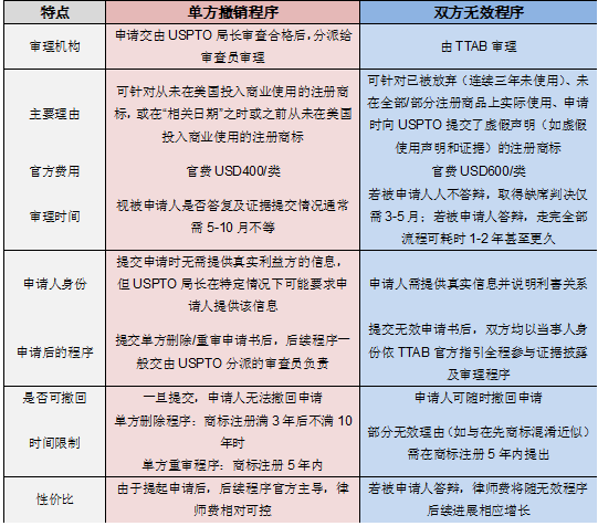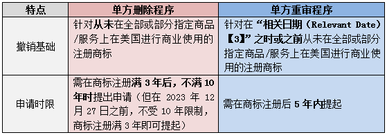 單方撤銷程序分為單方刪除程序和單方重審程序,根據(jù)美國《商標法》第16A、16B條及《審查指南》第1716條的規(guī)定,筆者將這兩項程序簡要對比如下表: