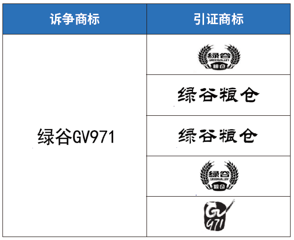 ”和引證商標(biāo)1-4相比較,其中文部分僅為“綠谷”;即便其中還包含“GV971”,但是整體上沒有形成能夠和引證商標(biāo)區(qū)分開的含義。訴爭商標(biāo)和引證商標(biāo)5相比較,“GV971”部分完全相同,即便其中還包含“綠谷”,但依然很容易被視為雙方存在特定關(guān)聯(lián)。