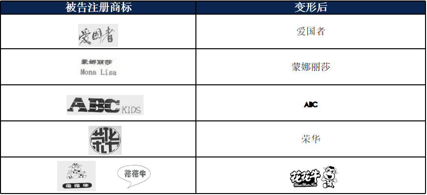 ”被認(rèn)定構(gòu)成“變形使用”、侵權(quán)成立。(2)若由于商業(yè)使用環(huán)境等客觀需要,導(dǎo)致被訴標(biāo)識(shí)與注冊(cè)樣式稍有差別,一般不輕易判為“變形使用”,如“蒙娜麗莎”“愛(ài)國(guó)者”“ABC”等案件。法院認(rèn)為,被訴標(biāo)識(shí)雖與注冊(cè)商標(biāo)有所差異,但未改變顯著特征,仍屬于對(duì)注冊(cè)商標(biāo)的合理使用。