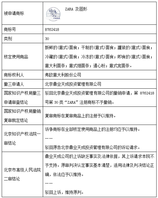 2019年01月15日,北京鼎業(yè)天成投資管理有限公司向國家知識產(chǎn)權(quán)局商標(biāo)局提交撤銷三年不使用申請,申請撤銷弗歐意大利股份公司名下第8762418“ZARA及圖形”商標(biāo)在第30類“新鮮的(意式)面食”等全部核定使用商品上的注冊。弗歐意大利股份公司在收到商標(biāo)局下發(fā)的提供使用證據(jù)通知后,于規(guī)定期限內(nèi)提交了答辯理由及被申請商標(biāo)在指定期限內(nèi)(即2016年01月15日至2019年01月14日)的使用證據(jù)。2019年08月27日,商標(biāo)局經(jīng)審查,裁定被申請商標(biāo)不予撤銷。