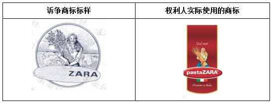 由以上對比可以看出,權(quán)利人實際使用的商標(biāo),圖形背景部分與注冊商標(biāo)形狀略有不同,文字部分也多了英文“pasta”,但“pasta”中文含義為“意大利面食”,實際上為訴爭商標(biāo)核定使用商品的通用名稱,因此自身缺乏顯著性,權(quán)利人實際使用的商標(biāo)顯著性識別要素仍為“ZARA及圖形”。