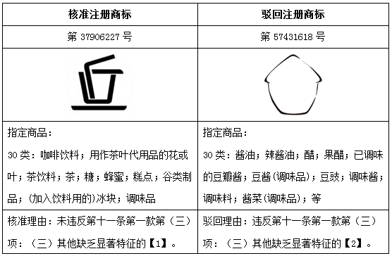 上表中被駁回案例,商標(biāo)整體由兩筆線條勾勒而成,且外觀十分容易聯(lián)想為其指定商品“醬油;辣醬油;醋”的容器外型,過于寫實(shí)的構(gòu)圖使消費(fèi)者難以從中提取出獨(dú)屬于商標(biāo)申請(qǐng)人的具體指向和概念,因此,即使該圖形并非相關(guān)行業(yè)常用的普通圖形,卻也難以起到區(qū)分商品來源的作用。