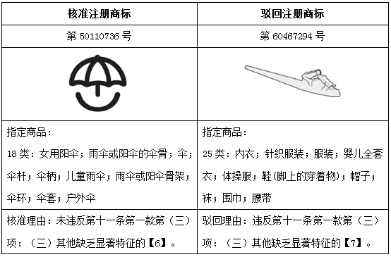 上述核準(zhǔn)案例中的“傘”圖形用在“陽傘”等商品上,并非直接表達(dá)了商品的外觀或特點(diǎn),其圖形整體呈現(xiàn)了一種愉悅又可愛的視覺感受,且并非行業(yè)通用圖形,予以注冊(cè)無可厚非。但駁回案例中的“鞋”圖形,為普通的鞋子外觀,站在消費(fèi)者的角度判斷,在鞋子或服飾商品上標(biāo)識(shí)鞋子圖形,理解為商品的裝飾性圖案似乎更符合常理,由此,難以作為商標(biāo)被核準(zhǔn)注冊(cè)。