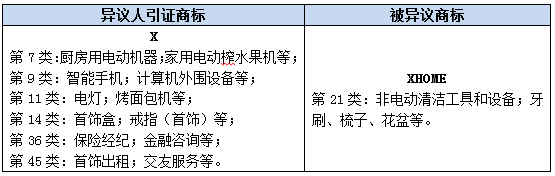 案例二:“X”商標(biāo)(07;09;11;14;35;36;37;38;41;42;45類) Vs.“ XHOME”(21類)