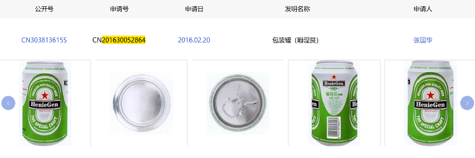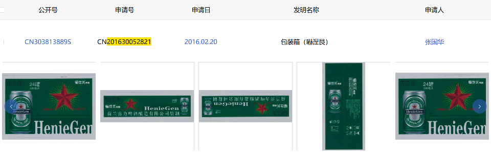 被告張國華于2016年將與喜力公司商標(biāo)近似的圖案、文字作為啤酒商品的包裝物申請了201630052864.8號和201630052821.X號外觀設(shè)計(jì)專利權(quán)。