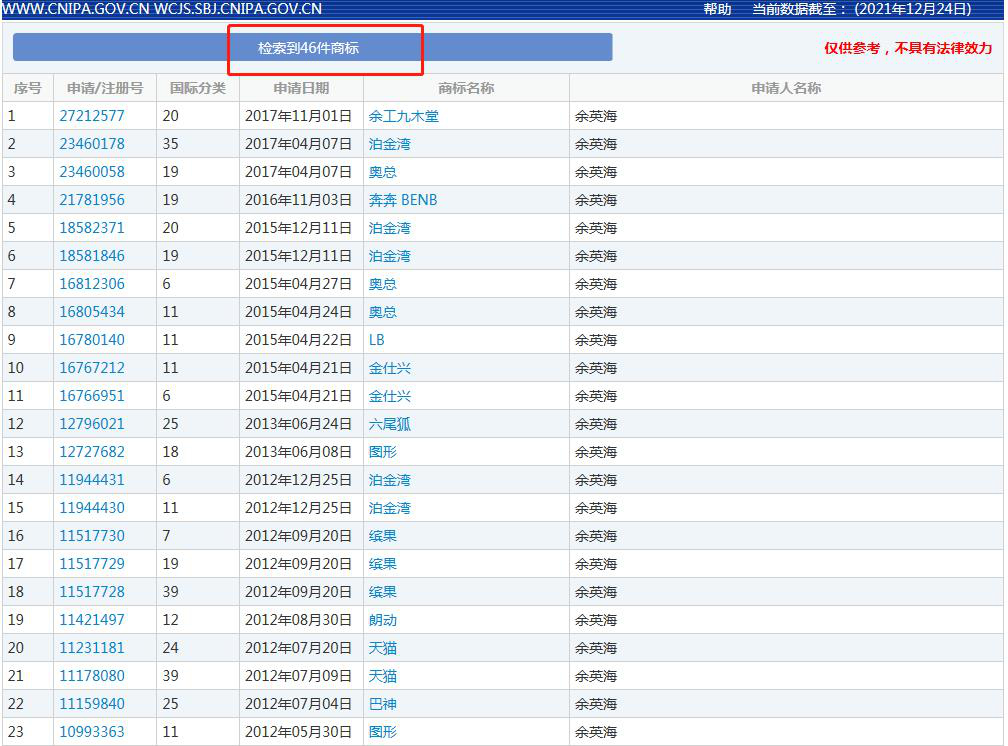 再次,經(jīng)查詢國家企業(yè)信用信息網(wǎng)和愛企查網(wǎng)站,爭議商標(biāo)原注冊人余英海名下無個體工商戶,也并不擔(dān)任任何企業(yè)的法人職務(wù),其不具有經(jīng)營主體的資格,其申請注冊商標(biāo)并獲準(zhǔn)注冊的行為,屬于以商標(biāo)法第四十四條第一款規(guī)定的欺騙手段注冊商標(biāo)的情形。同時,這進一步印證了爭議商標(biāo)原注冊人余英海不以使用為目的大量注冊商標(biāo)的情形。