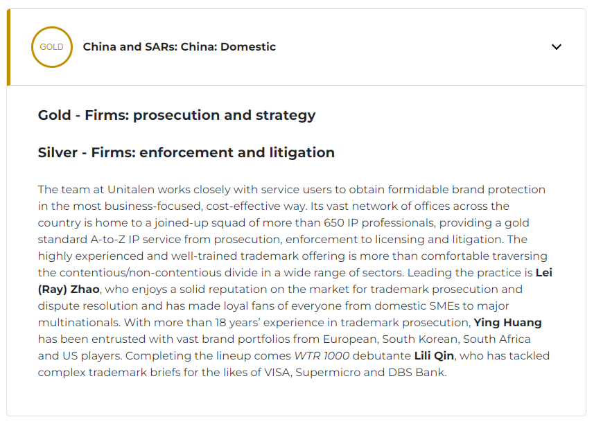WTR評(píng)價(jià):“作為團(tuán)隊(duì)的領(lǐng)軍人物,趙雷律師在商標(biāo)申請(qǐng)和爭(zhēng)端解決方面享有卓著聲譽(yù),在從國(guó)內(nèi)中小企業(yè)到大型跨國(guó)公司中都擁有的忠實(shí)擁躉?!?/em>