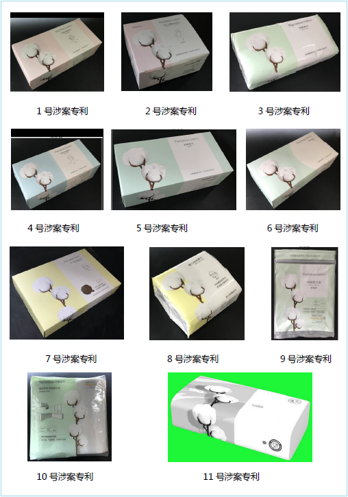 涉案專利均為棉柔巾產(chǎn)品的外包裝盒及外包裝袋,具有相似的設計元素和設計風格。其中,10件專利的申請日為2017年6月5日,1件專利的申請日為2019年1月10日,所有專利均未對外觀設計的顏色予以保護。