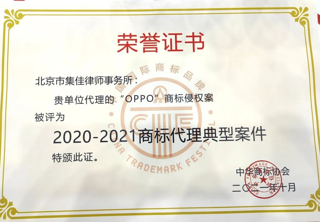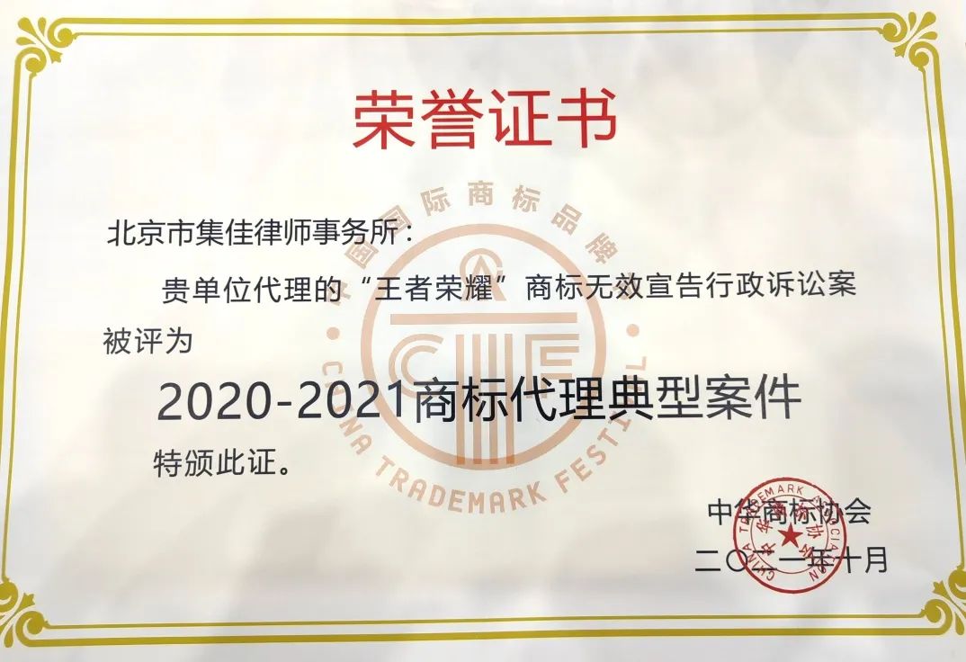 6月17日,第十三屆中國國際商標品牌節(jié)正式拉開帷幕,各項活動火熱進行。在“商標典型案例評析論壇”上,集佳律師事務所代理的“第33類‘王者榮耀’無效宣告行政訴訟案”和“OPPO侵權案”因其體現(xiàn)出的創(chuàng)新性、實效性、典型性和影響力,在眾多案例中脫穎而出,雙雙入選“2020-2021商標代理典型案件”。