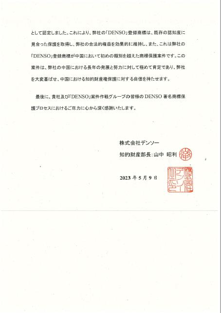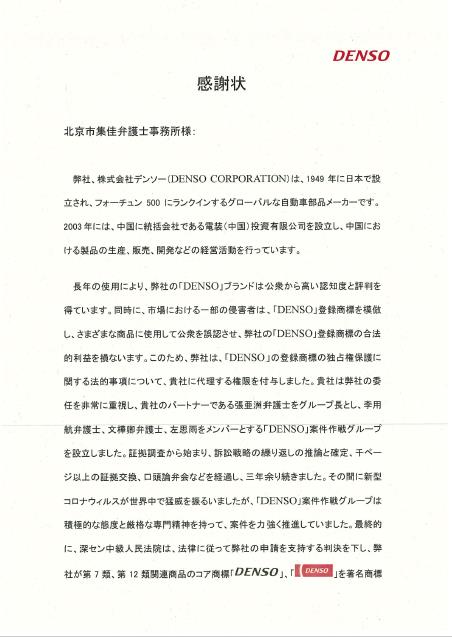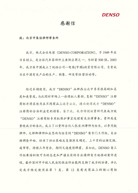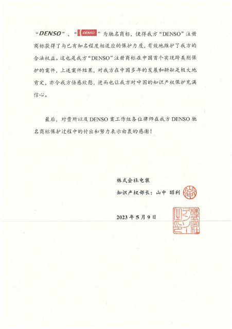 The above case is the first case in which cross-class protection for the registered trademark "DENSO" is realized in China. Through this case, Unitalen successfully represented the client to obtain for its registered trademark "DENSO" the protection that is commensurate with its existing popularity, and effectively safeguarded the legitimate rights and interests of the client.