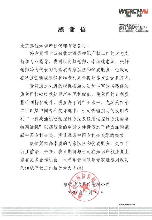 濰柴動力在感謝信中表示,集佳十四余年來對濰柴知識產(chǎn)權(quán)工作的大力支持和專業(yè)指導(dǎo),尤其是集佳肖虹、李海建、張靜等高素質(zhì)專家隊伍的優(yōu)質(zhì)服務(wù),讓濰柴動力在科技創(chuàng)新成果保護和專利質(zhì)量提升等方面受益頗多,特別是集佳以高質(zhì)量的申請文件撰寫水平,助力濰柴發(fā)明專利獲得中國專利金獎,使濰柴實現(xiàn)了中國專利金獎零的突破,期待雙方未來在知識產(chǎn)權(quán)業(yè)務(wù)上開展更多合作!