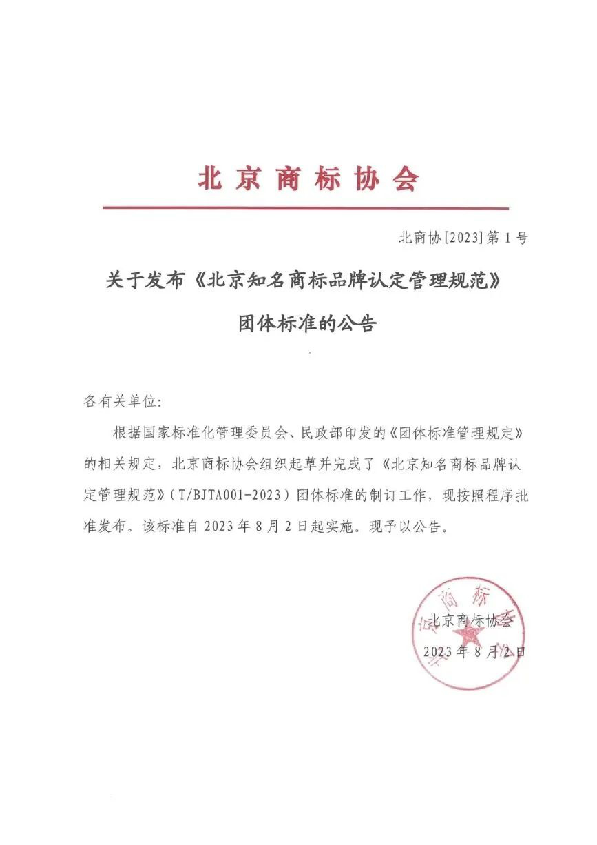 為保護(hù)北京知名商標(biāo)品牌的權(quán)利人、使用者和消費(fèi)者的合法權(quán)益,提升商標(biāo)品牌價值,促進(jìn)企業(yè)提質(zhì)增效,同時為貫徹國家知識產(chǎn)權(quán)局《深入實(shí)施〈關(guān)于強(qiáng)化知識產(chǎn)權(quán)保護(hù)的意見〉推進(jìn)計劃》的政策精神,把北京打造成國內(nèi)及國際商標(biāo)品牌保護(hù)的新高地,將北京品牌推向全國及世界,塑造北京商標(biāo)品牌保護(hù)高水平、高質(zhì)量發(fā)展的新形象,北京商標(biāo)協(xié)會根據(jù)《中華人民共和國商標(biāo)法》《中華人民共和國標(biāo)準(zhǔn)化法》等有關(guān)法律法規(guī)的規(guī)定,經(jīng)反復(fù)討論分析,起草了《北京知名商標(biāo)品牌認(rèn)定管理規(guī)范》(討論草案),并多次組織相關(guān)專家學(xué)者就內(nèi)容進(jìn)行論證,廣泛征詢各個行業(yè)的意見,積極采納相關(guān)修改建議,最終形成《北京知名商標(biāo)品牌認(rèn)定管理規(guī)范》(T/BJTA 001-2023),該標(biāo)準(zhǔn)自2023年8月2日實(shí)施。
