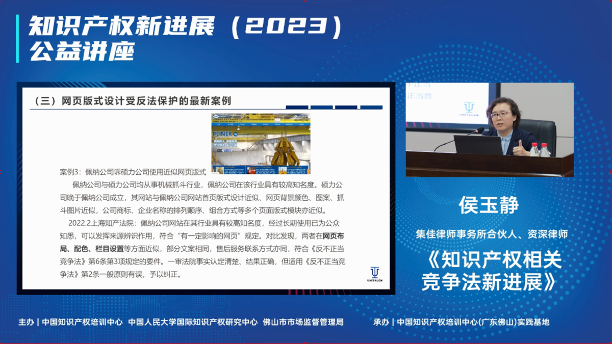 2023年9月7日,由中國(guó)知識(shí)產(chǎn)權(quán)培訓(xùn)中心、中國(guó)人民大學(xué)國(guó)際知識(shí)產(chǎn)權(quán)研究中心、佛山市市場(chǎng)監(jiān)督管理局聯(lián)合主辦的“知識(shí)產(chǎn)權(quán)新進(jìn)(2023)公益講座”在中國(guó)知識(shí)產(chǎn)權(quán)培訓(xùn)中心(廣東佛山)實(shí)踐基地舉行,集佳合伙人侯玉靜律師應(yīng)邀參加公益講座并發(fā)表主題演講。