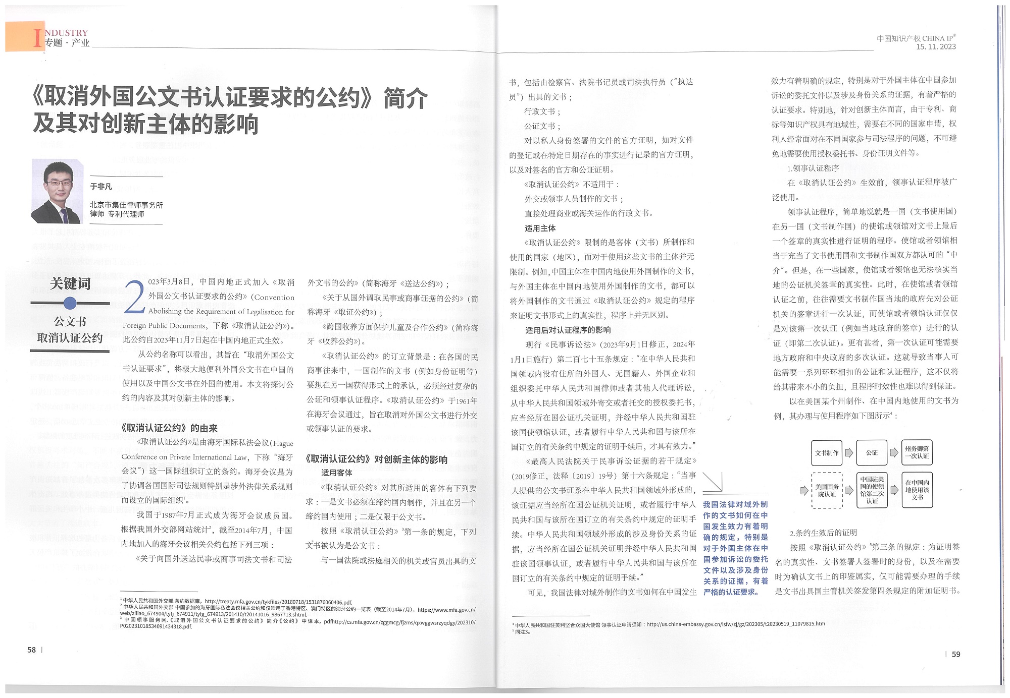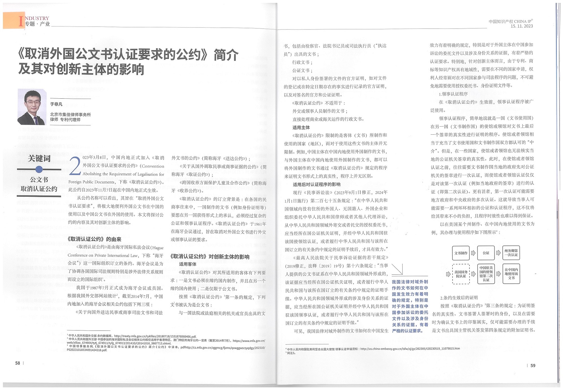 集佳文章《<取消外國公文書認(rèn)證要求的公約>簡介及其對創(chuàng)新主體的影響》在《中國知識產(chǎn)權(quán)》發(fā)表