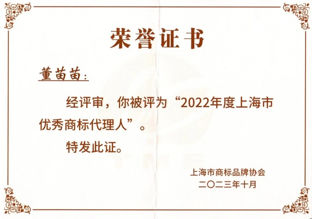 集佳上海分所董苗苗律師被評為2022年度“上海市優(yōu)秀商標代理人”。
