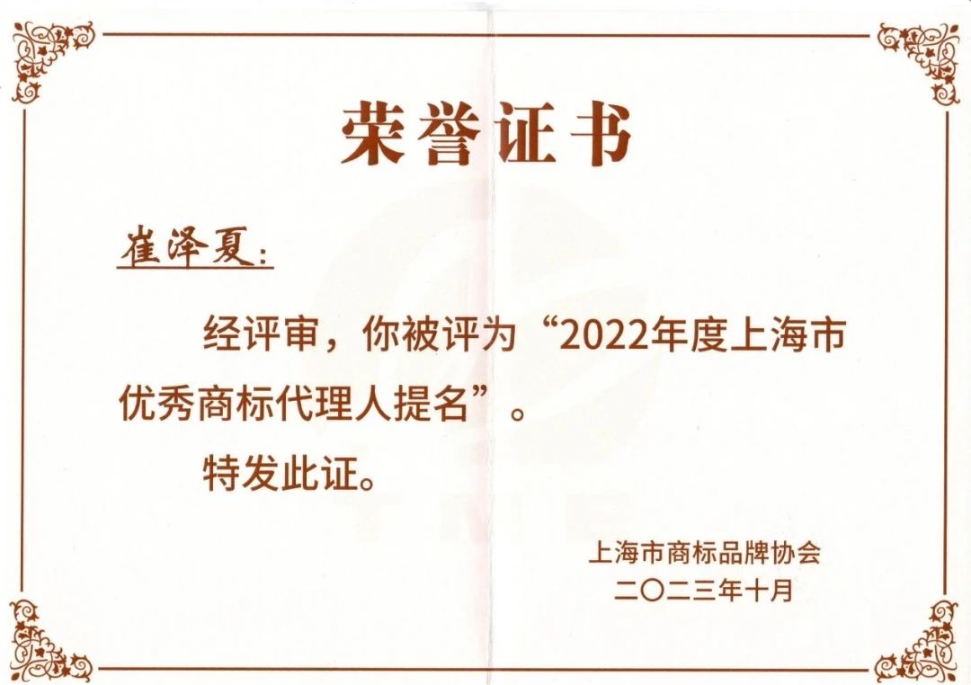 集佳上海分所崔澤夏律師獲得2022年度“上海市優(yōu)秀商標代理人提名”。