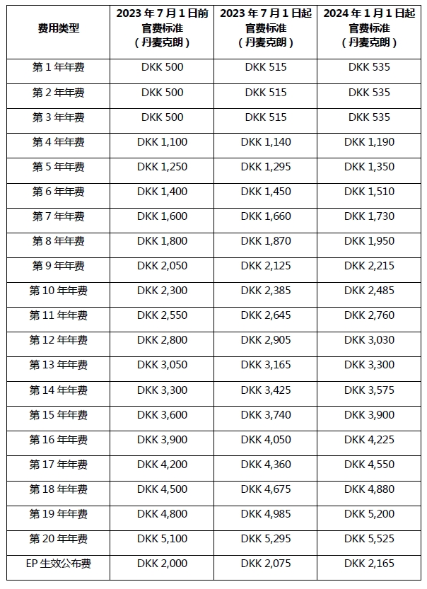 早在2023年7月1日,丹麥專利商標(biāo)局已對(duì)這些費(fèi)用進(jìn)行過一次調(diào)整,兩次調(diào)整的官費(fèi)費(fèi)用明細(xì)如下: