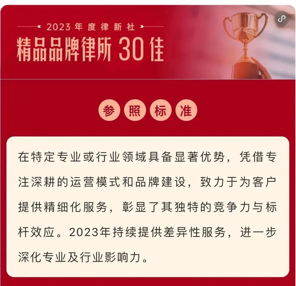 集佳律所入選 “2023年度律新社精品品牌律所30佳”