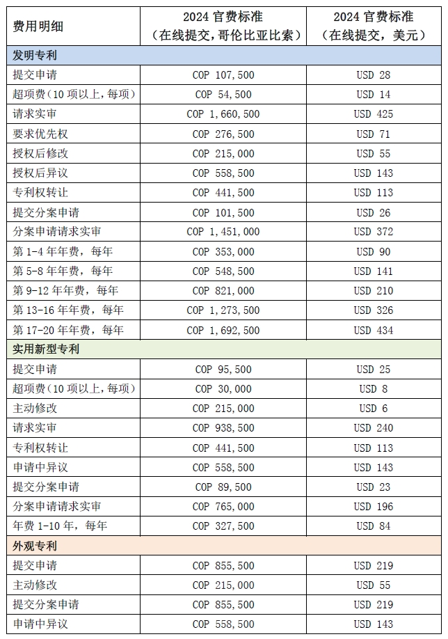 日前,哥倫比亞工商監(jiān)管局發(fā)布了關(guān)于2024年工業(yè)產(chǎn)權(quán)稅率調(diào)整的第60687號決議(Resolución No. 60687),調(diào)整后的新官費標(biāo)準(zhǔn)已于2024年1月1日生效。具體費用明細(xì)如下:
