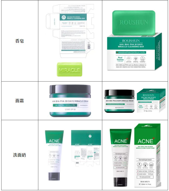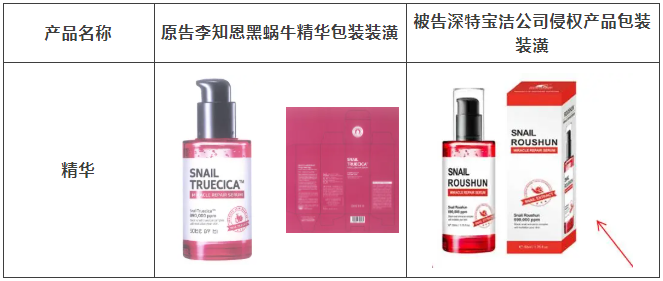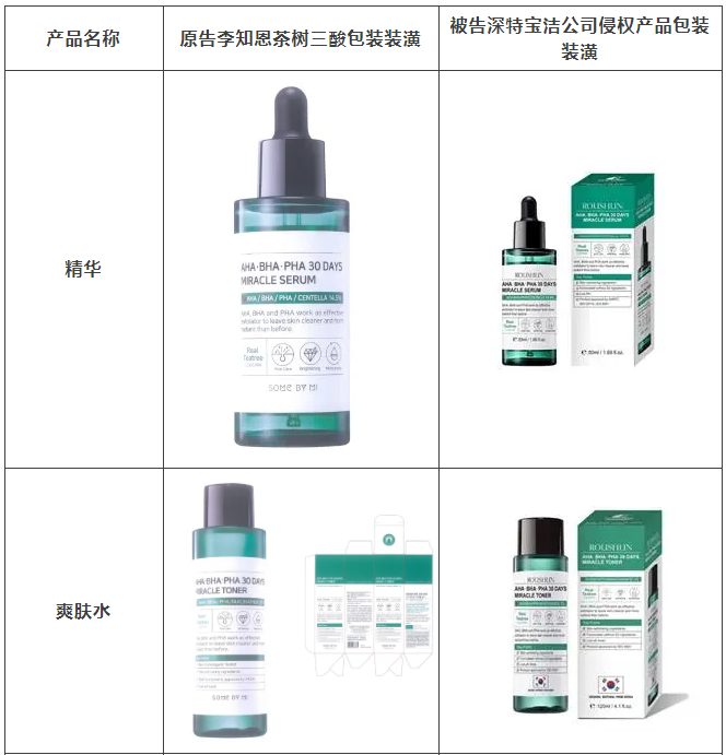 2021年原告委托北京市集佳律師事務(wù)所調(diào)查發(fā)現(xiàn),被告汕頭市深特寶潔實(shí)業(yè)有限公司生產(chǎn)、銷售和推廣的“茶樹(shù)祛痘美白補(bǔ)水液”“茶樹(shù)香皂”等護(hù)膚品,其產(chǎn)品包裝裝潢直接抄襲、摹仿原告前述已經(jīng)具有較高知名度和影響力的“SOME BY MI/莎柏蜜”茶樹(shù)三酸系列化妝品和黑蝸牛精華液的包裝、裝潢設(shè)計(jì),使用與之近似的標(biāo)識(shí),造成消費(fèi)者混淆誤認(rèn)。故原告作為茶樹(shù)三酸、黑蝸牛精華包裝裝潢權(quán)益獲益人,訴至廣東省汕頭市中級(jí)人民法院。汕頭中院認(rèn)定:李知恩主張的茶樹(shù)三酸、黑蝸牛精華包裝裝潢構(gòu)成具有一定影響的包裝裝潢,深特寶潔公司生產(chǎn)、銷售茶樹(shù)三酸、黑蝸牛精華液的行為構(gòu)成不正當(dāng)競(jìng)爭(zhēng)。因判賠額不符合原告預(yù)期,原告后上訴至廣東省高級(jí)人民法院,廣東省高級(jí)人民法院最終維持一審判決。