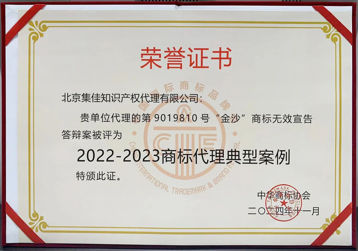 2024年11月24日下午,在商標(biāo)節(jié)經(jīng)典論壇之一的商標(biāo)典型案例評析會議上,北京市集佳律師事務(wù)所代理的“金沙”商標(biāo)權(quán)無效宣告答辯案入選“2022-2023商標(biāo)代理典型案例”。