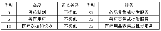 其次,在中國已經(jīng)接受的3509類似群的藥品、醫(yī)療用品零售或批發(fā)服務(wù),在與其他商品或服務(wù)的類似性判斷時,根據(jù)《類似商品和服務(wù)區(qū)分表》的規(guī)定,其僅與歸屬于本類似群的服務(wù)構(gòu)成相同類似服務(wù),與該零售或批發(fā)服務(wù)所涉及的具體商品并不發(fā)生交叉檢索【4】。舉例如下: