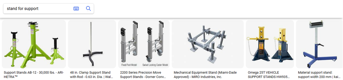 使用圖片搜索以模擬閱讀者對(duì)術(shù)語(yǔ)的理解,十分適用于機(jī)械領(lǐng)域的術(shù)語(yǔ)辨析,尤其是針對(duì)家電等生活化的領(lǐng)域。比如,“bracket”和“stand”是“支架”的兩種翻譯,通過圖片搜索,可以清晰看到其差別,即“bracket”多指安裝在墻上的支架,而“stand”多指立式支架,如圖2所示。