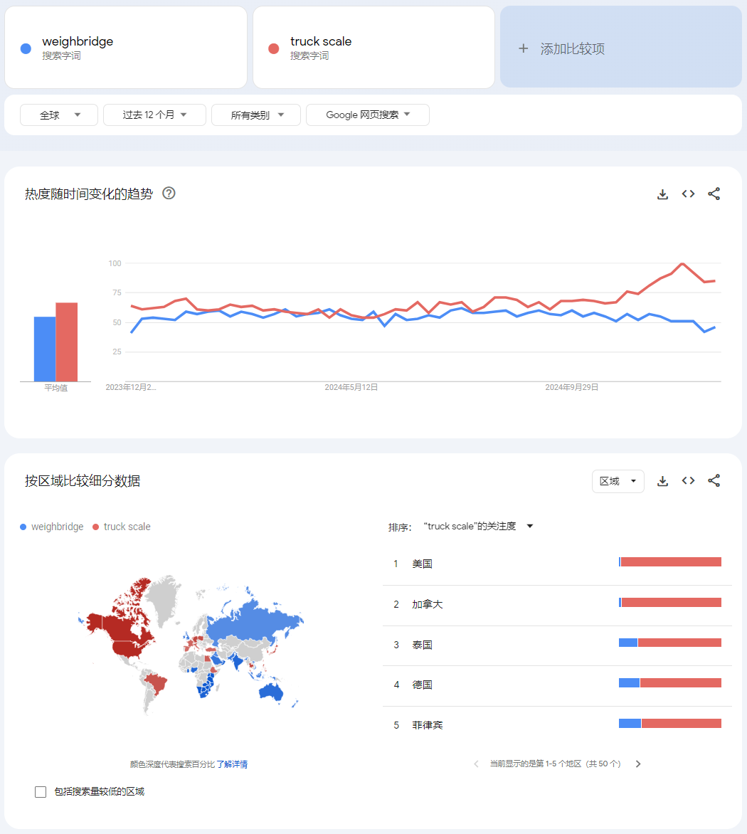 谷歌趨勢(shì)呈現(xiàn)了詞語(yǔ)被全球用戶搜索的頻率。通過谷歌趨勢(shì),我們可以對(duì)比一個(gè)術(shù)語(yǔ)的多種翻譯的常見程度,以及在不同國(guó)家的偏好。尤其是對(duì)于名詞短語(yǔ),通過比較不同搭配的常見程度,可以確定它們的自然程度。如圖3所示,對(duì)于“地磅”這個(gè)術(shù)語(yǔ),北美和歐陸地區(qū)傾向于使用“truck scale”,而英國(guó)、印度、澳大利亞等傾向于使用“weighbridge”,兩者總體的使用頻率卻差別不大,因此可以根據(jù)申請(qǐng)進(jìn)入的國(guó)家選擇最合適的譯文,有利于為客戶提供更精細(xì)化的服務(wù)。在另一些應(yīng)用中,使用頻率偏小的譯法可能意味著不夠地道,因此為術(shù)語(yǔ)翻譯提供了參考。